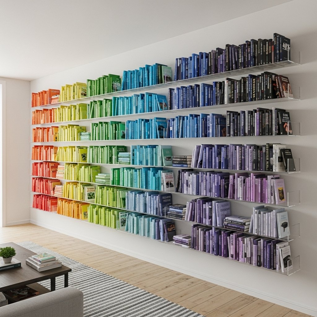 This expansive wall display transforms a book collection into a vibrant spectrum of color. Long, clear acrylic shelves span the wall, making the books appear to float. The arrangement of books follows a meticulously organized color gradient.