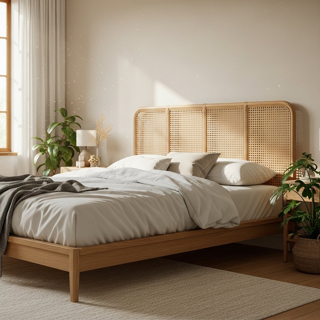 Embrace natural textures and a touch of bohemian charm with a beautiful woven rattan headboard. This light wood frame features an arched design with distinct rattan panels, allowing light and air to flow through. It instantly adds a warm, inviting, and organic feel to any bedroom.