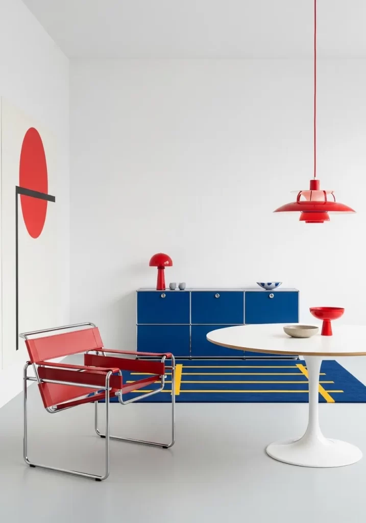 - Lay a circular orange rug under the dining table to define that specific zone.