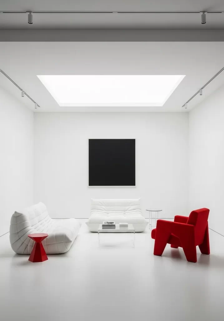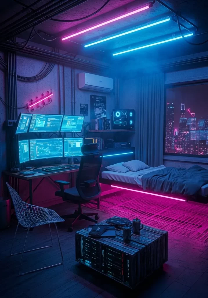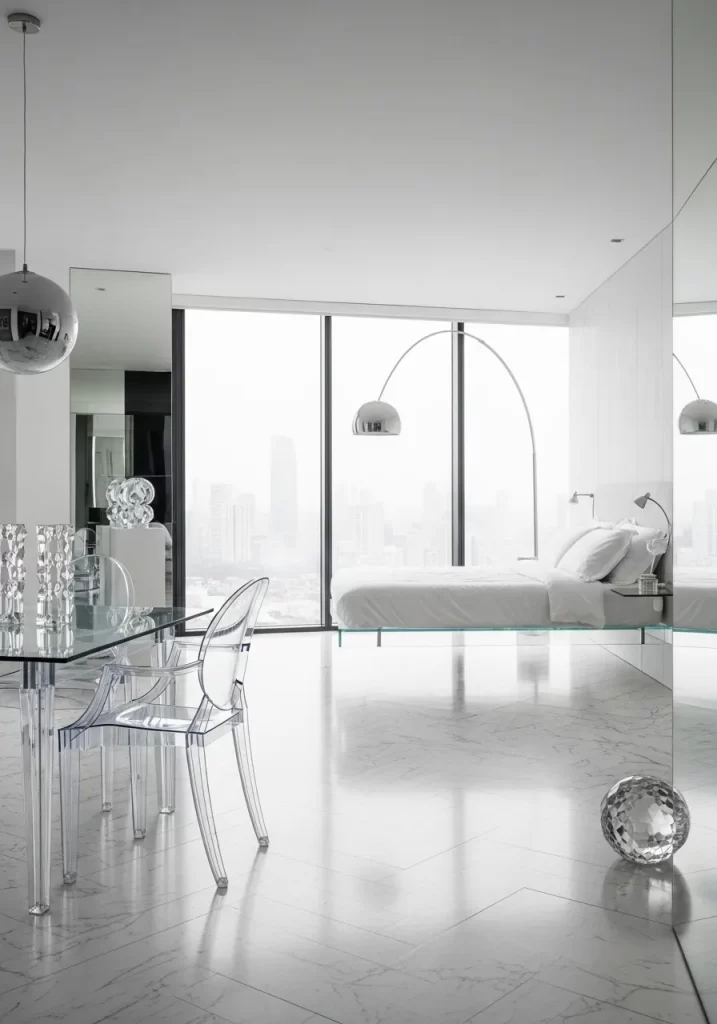 A circular wall cutout provides a view of the bedroom, making the apartment feel more connected and open. The glowing LED lights under the furniture and the lava lamps add a playful, psychedelic touch. This design is about bold shapes and high-contrast colors, making it perfect for the person who loves 1960s futurism. It utilizes circular forms to soften the sharp corners of a small, rectangular room.