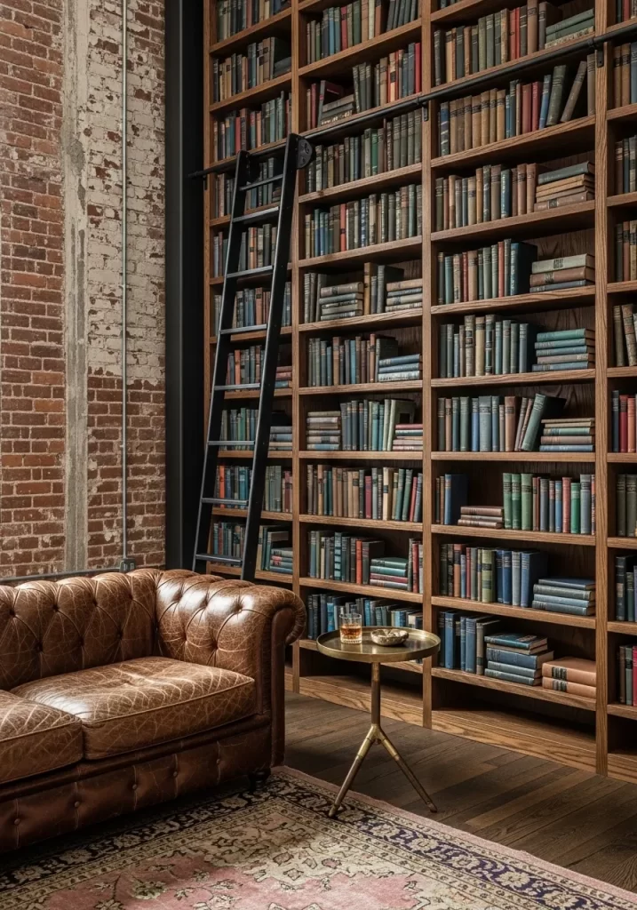 Warm lighting is key to making this dark palette feel inviting rather than gloomy. Exposed Edison bulbs hanging from the ceiling and amber-hued floor lamps create a soft, sunset glow. By filling the shelves with books, vinyl records, and glassware, you turn your storage into a piece of art. The brick wall backdrop adds texture and reinforces the urban loft feel, making the entire apartment look intentional and curated.