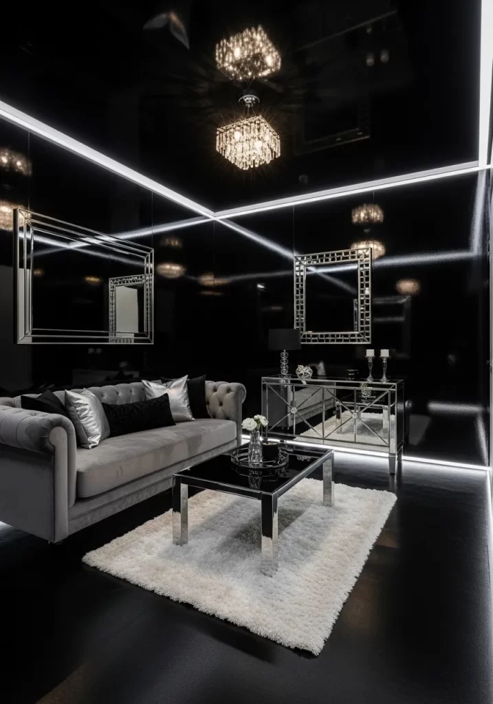 The sunburst gold mirror and the tiered crystal chandelier add massive amounts of shine and luxury to a small room. A black and gold patterned rug defines the seating area and reinforces the geometric theme. This design is for the person who loves 1920s style and wants a home that feels like a sophisticated cocktail lounge. It utilizes mirrors and reflective surfaces to bounce light and make the room feel grand.