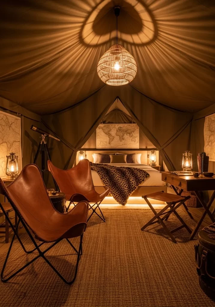 A chunky knit blanket and a cowhide rug add layers of texture that make the room feel incredibly inviting. The warm LED lighting hidden in the ceiling creates a soft, golden glow that mimics a sunset. This design is for the person who wants a home that feels like a peaceful getaway from the busy city. It utilizes the ceiling for hidden lighting, which frees up table and floor space for other decor.