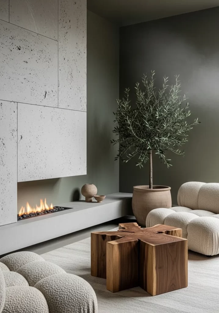 A low-profile fireplace provides a cozy glow without taking up the vertical space a traditional hearth requires. You can complement this look with sculptural furniture, such as a cloud-like textured chair and a raw wood stump coffee table. Adding a tall indoor tree like an olive or ficus brings life to the corner and draws the eye upward. This design proves that even a small space can handle bold textures if you keep the color palette earthy and muted.