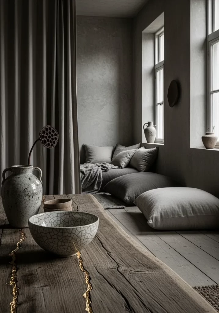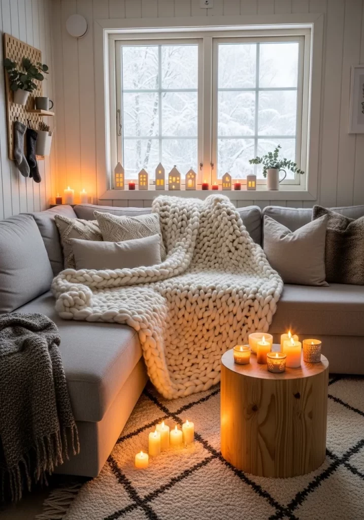 When the weather turns cold, your apartment should feel like a warm hug. This hygge-inspired aesthetic focuses on extreme comfort through heavy textures and soft lighting. A chunky knit wool blanket draped over the sofa is the star of this look, providing instant warmth and visual interest.