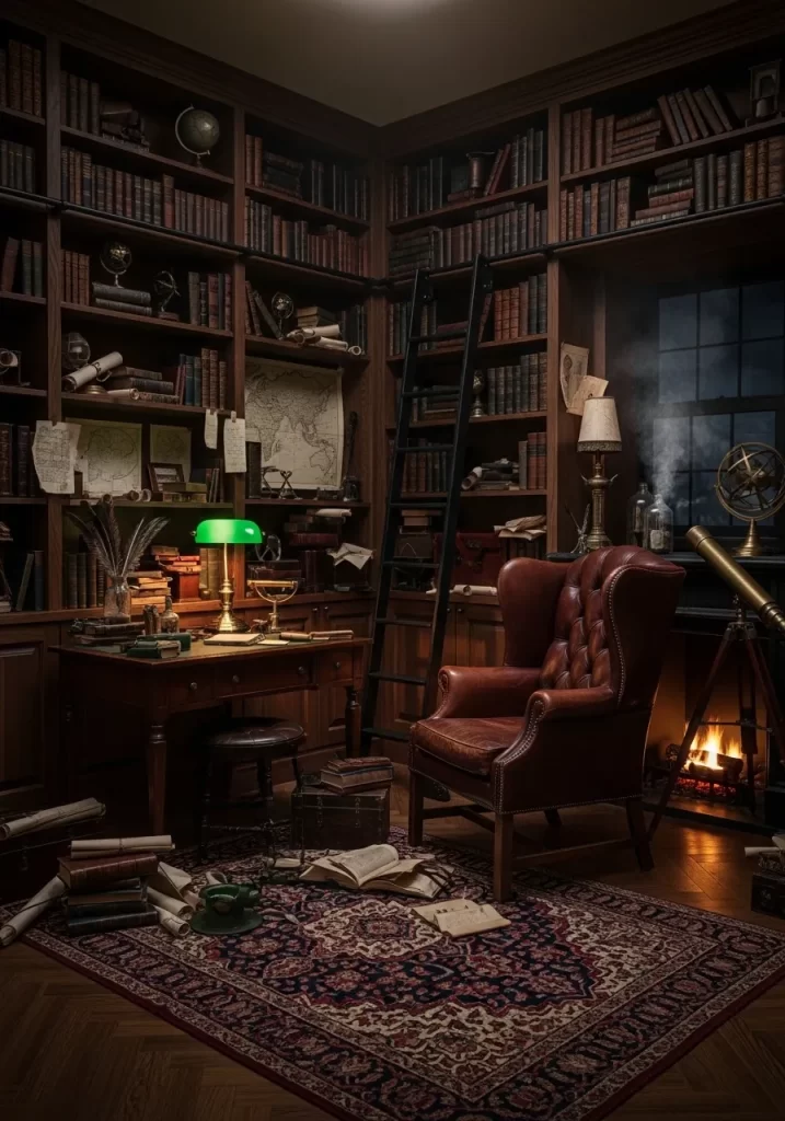 The Art Deco aesthetic is all about glamour, geometry, and rich colors. This look uses gold-patterned black wallpaper and emerald green shell-shaped chairs to create a high-end speakeasy vibe. A mirrored bar cabinet with geometric gold details serves as the perfect spot for entertaining guests.