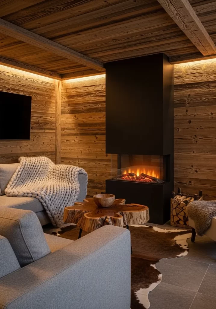 Small apartments can feel like a cozy mountain cabin with the right wood and stone elements. This aesthetic uses floor-to-ceiling wooden wall paneling and a raw-edge wood coffee table to create a warm, rustic environment. A sleek black modern fireplace provides a sharp contrast to the natural wood tones.