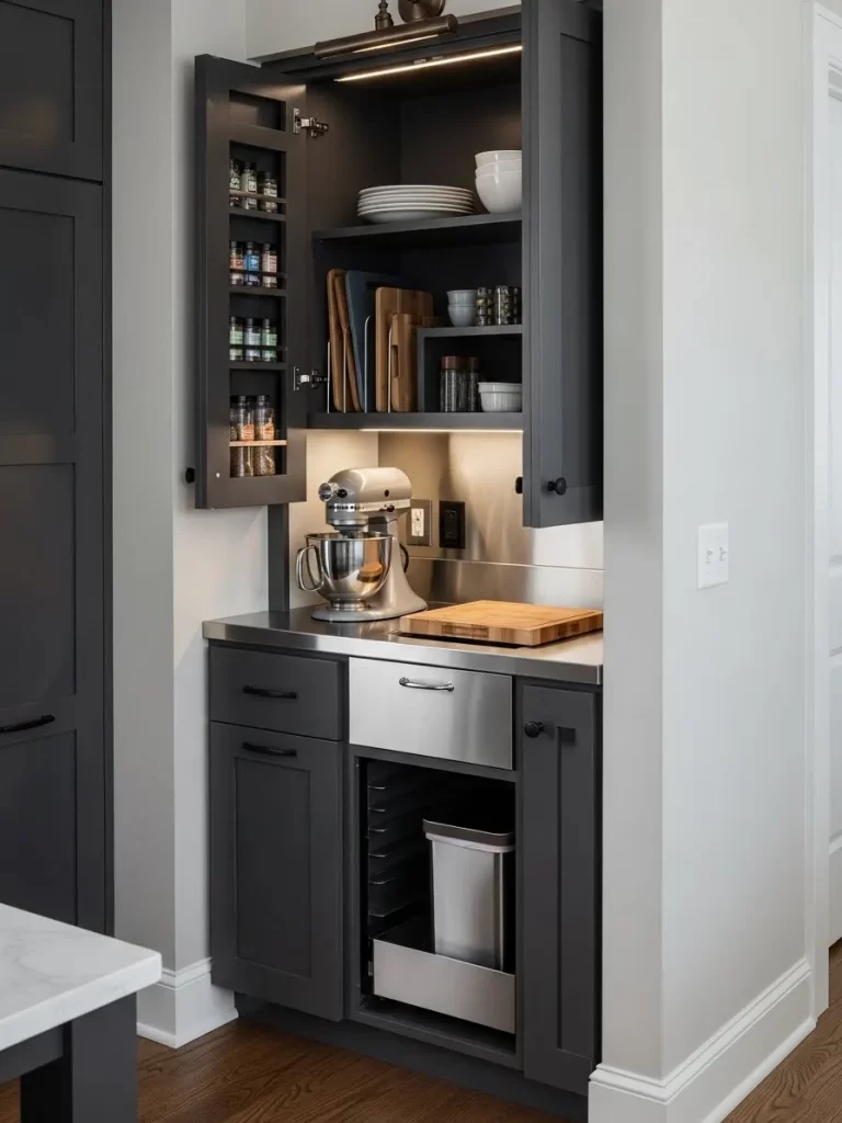 Adjustable shelves and small spice racks on the inside of the cabinet doors maximize every available inch, ensuring that small items are not lost or forgotten. This thoughtful arrangement turns a narrow alcove into a powerful, organized extension of the main kitchen workspace.