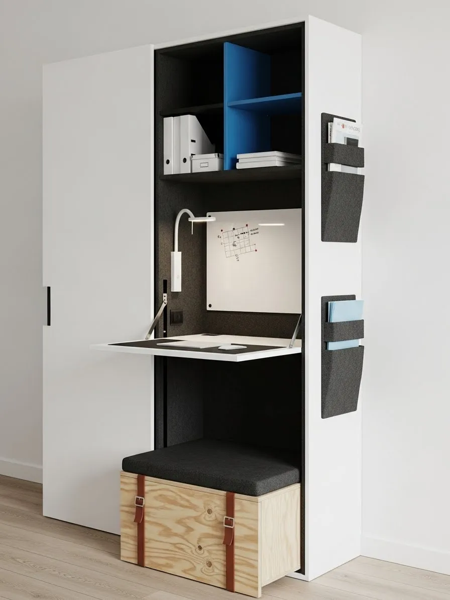 This clever piece of furniture masterfully hides a functional workspace within a sleek, modern wardrobe or cabinet. The clean white exterior contrasts sharply with the dark interior, which is lined with sound-dampening material for a focused work environment. When closed, the unit presents a seamless, uncluttered facade.