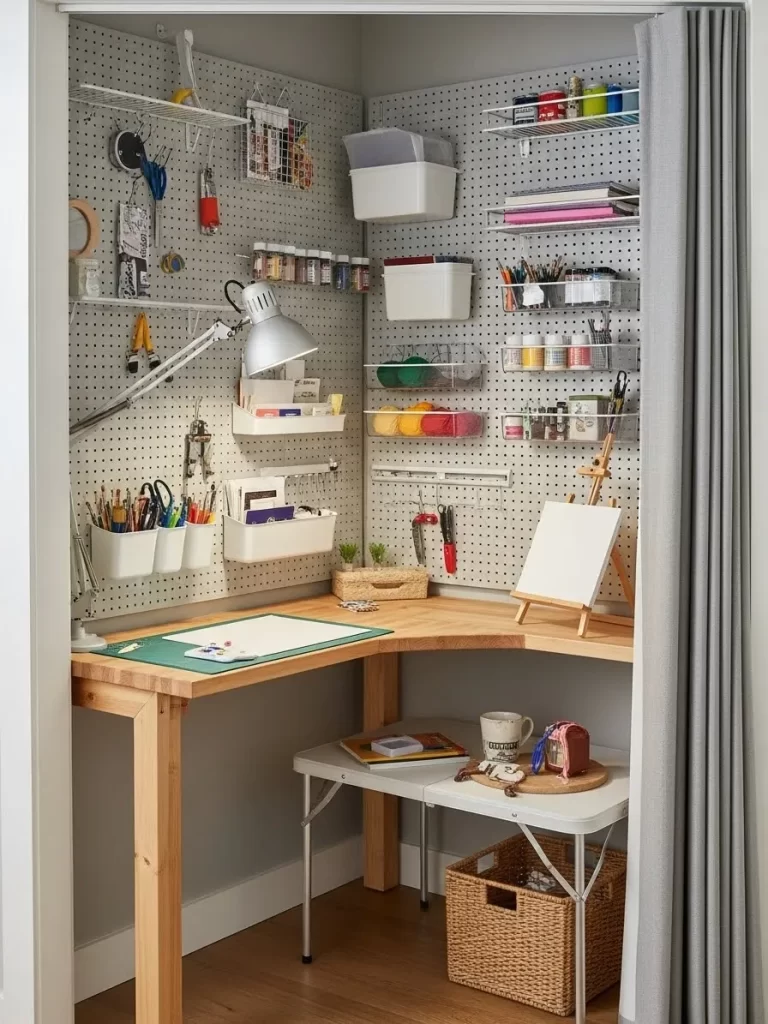 This ingenious design converts an ordinary walk-in closet into a fully functional, highly organized craft and art studio. The closet doors are removed and replaced with a curtain, providing easy access and soft closure. The entire space is lined with pegboard, transforming every square inch into customizable storage.