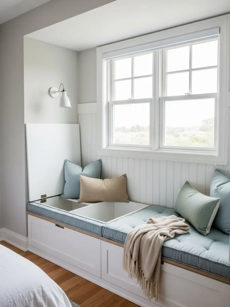 The bench seating is exceptionally inviting, topped with a thick, comfortable cushion and layered with plush throw pillows in earthy tones. Beneath the seat, integrated drawers or cabinets offer discreet storage for extra blankets or electronic devices, keeping the area tidy. A wall-mounted lamp provides focused light, making this the ideal spot for curling up with a good story at any time of day.