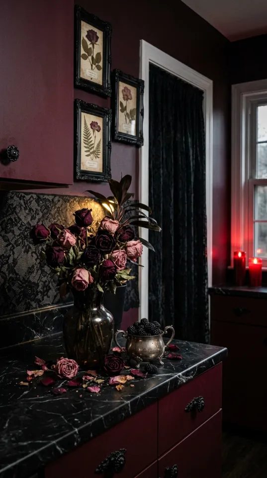 You can easily replicate this aesthetic without painting walls or replacing cabinets. It feels authentic and cozy. Such small details turn a plain rental into a dark cottagecore dream. Every piece serves a purpose and adds to the story of the room.
