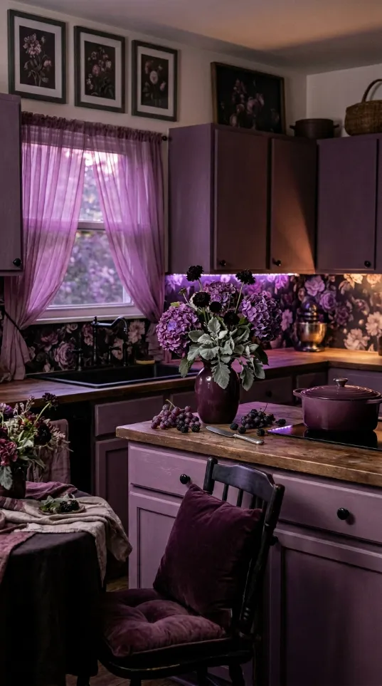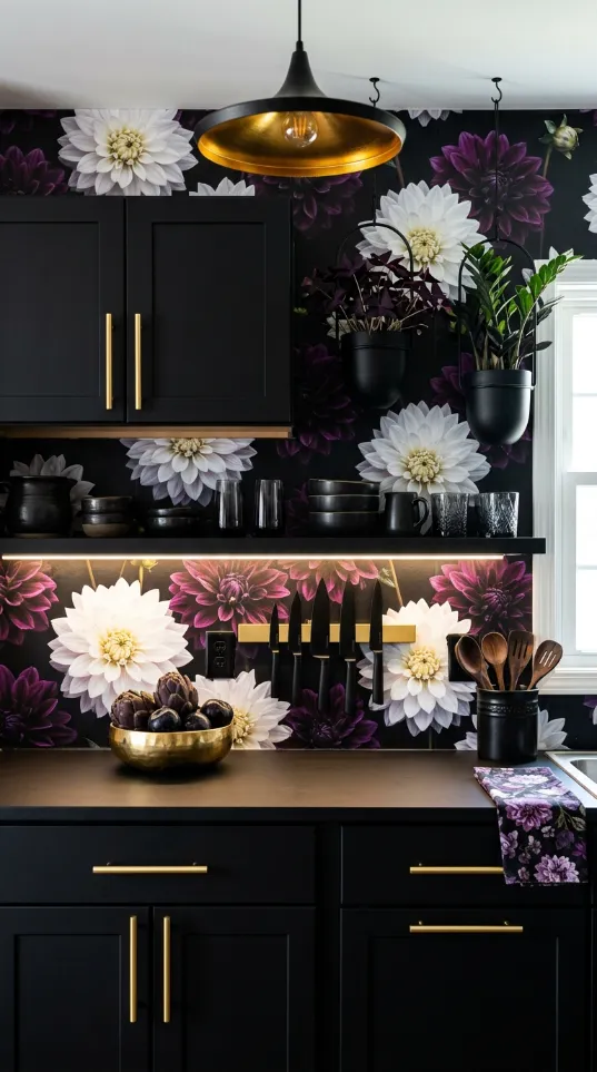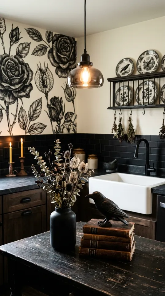 Bold black and white rose patterns bring a gothic edge to the kitchen walls. Large floral designs make a strong statement without needing paint. A black plate rack displays vintage dishes adorned with crows. This look embraces the mystery of the dark cottagecore style.