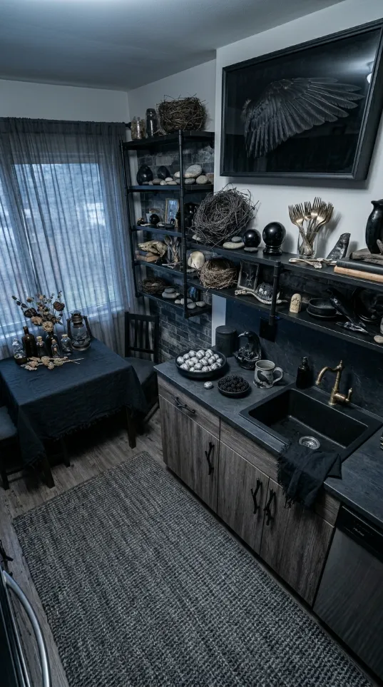 Natural elements like dried eucalyptus sit in a matte black vase. A small raven figurine perched on a stack of old books completes the theme. It feels like an apothecary kitchen from a storybook. Using peel and stick wallpaper ensures you can remove it when you move.