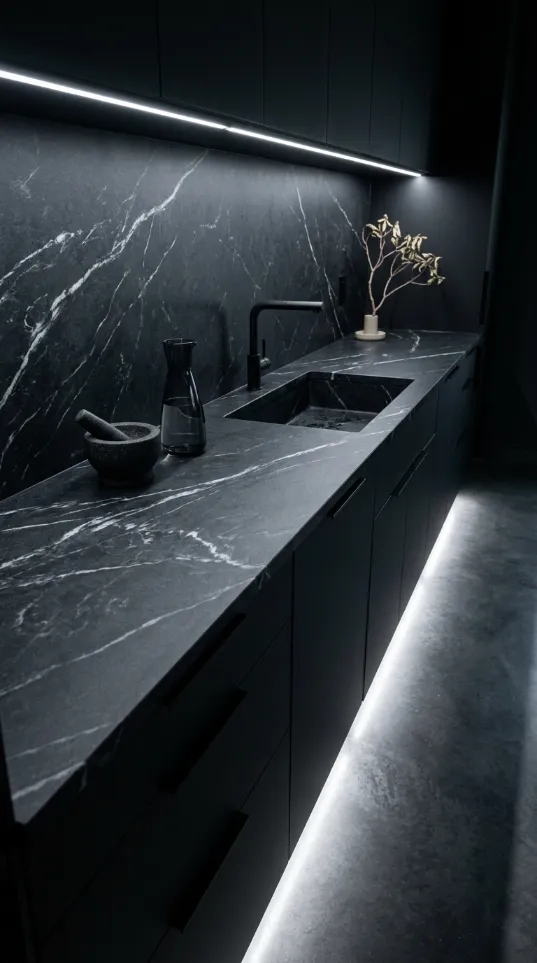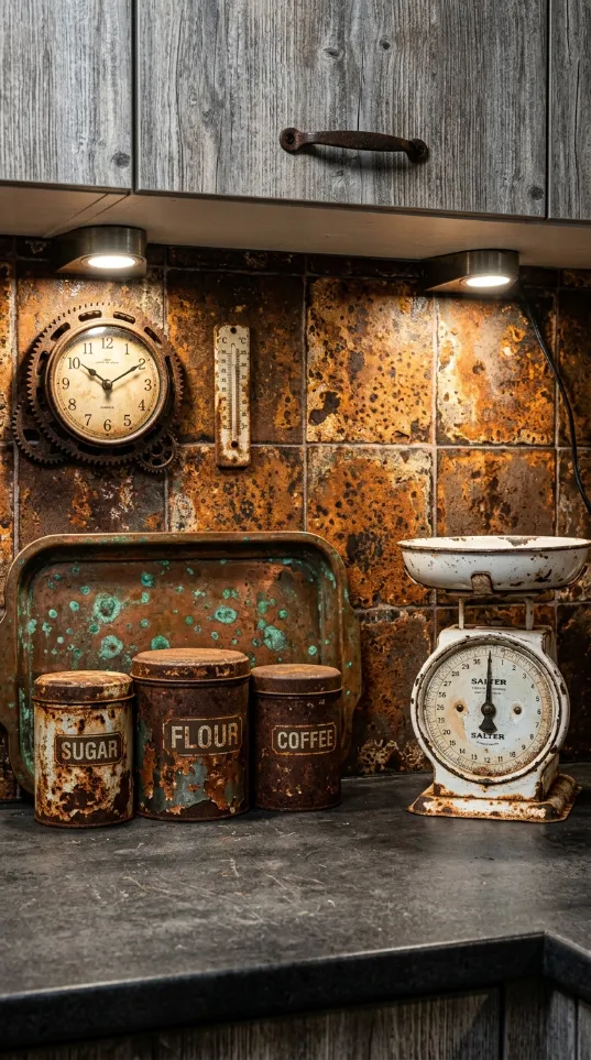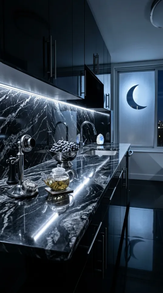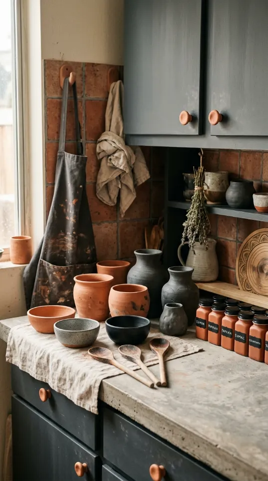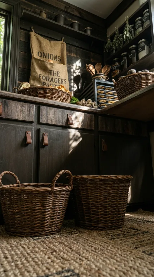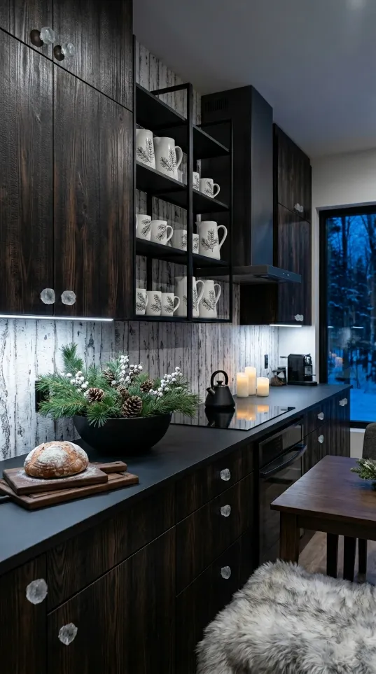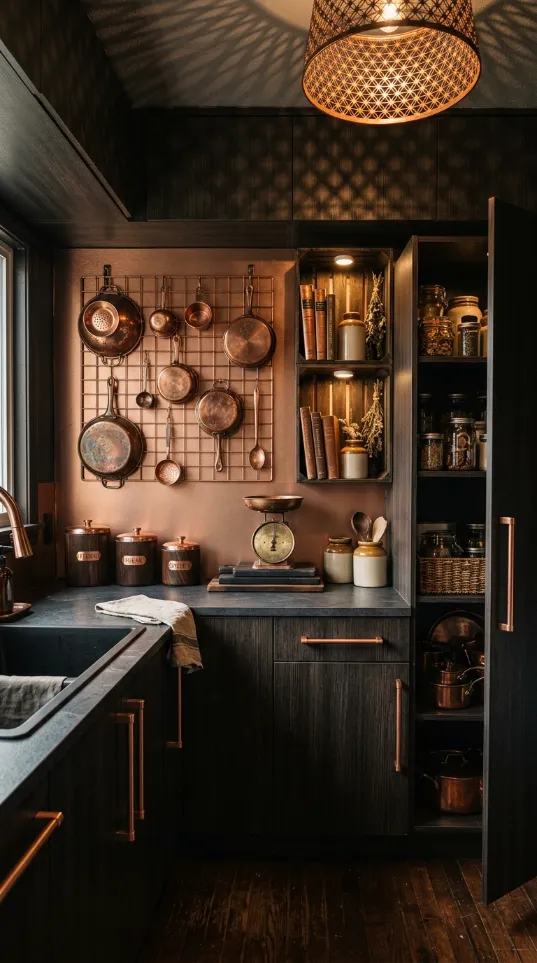 This simple addition creates an earthy scent and a rustic visual. Dark counters benefit from the warm glow of amber glass bottles. Those jars store your essential oils or spices while looking like vintage treasures.