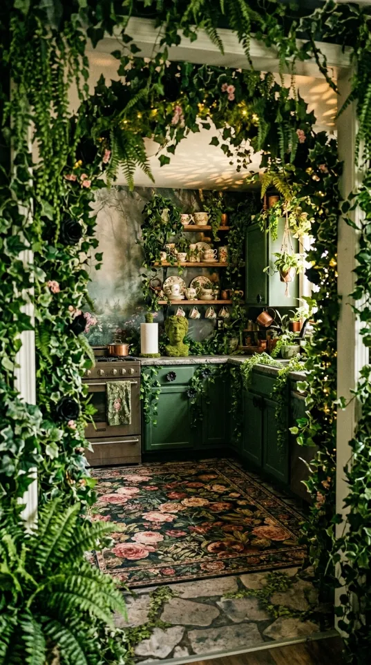 Rental living usually means staring at boring white walls and plain cabinets. You likely want a space that feels like a moody forest retreat. Dark cottagecore is the answer to your bland kitchen woes.