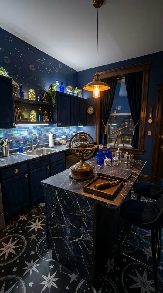Deep navy walls decorated with gold constellations turn the room into a midnight sky. This theme uses celestial patterns to create a magical feeling. You can use floor decals to bring stars to your feet. Blue glass bottles and alchemy jars line the shelves for an ancient look.