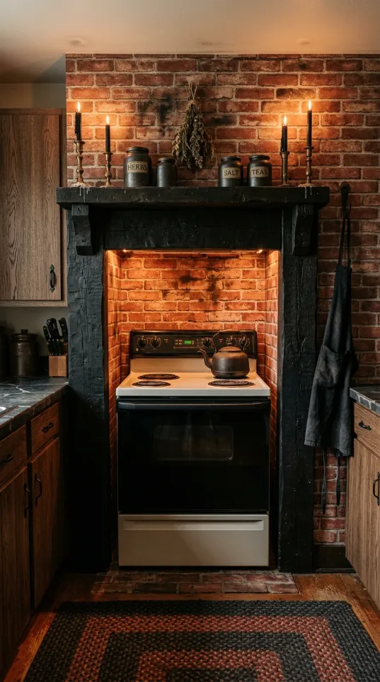 Candles in tall brass holders illuminate the brick textures at night. This design bridges the gap between old world style and new appliances. You can use faux brick panels to create this look in a rental. It feels like the warm heart of a country manor. Every meal feels like it was cooked over an open flame. You will love the cozy and traditional atmosphere.