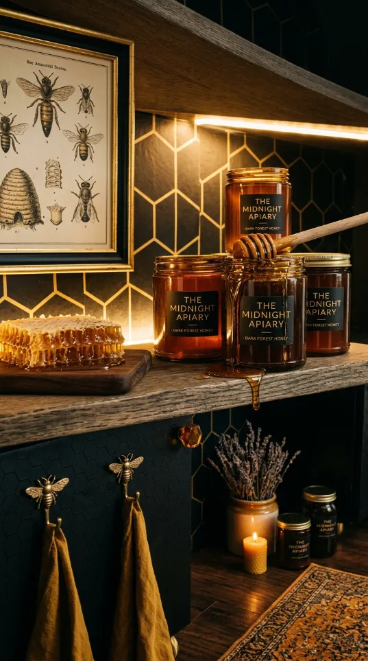 Golden honey jars with black labels glow on a wooden shelf. A framed bee diagram adds a scientific touch to the wall. Brass bee hooks hold your kitchen towels with style. This theme celebrates the magic of the hive in a moody setting.