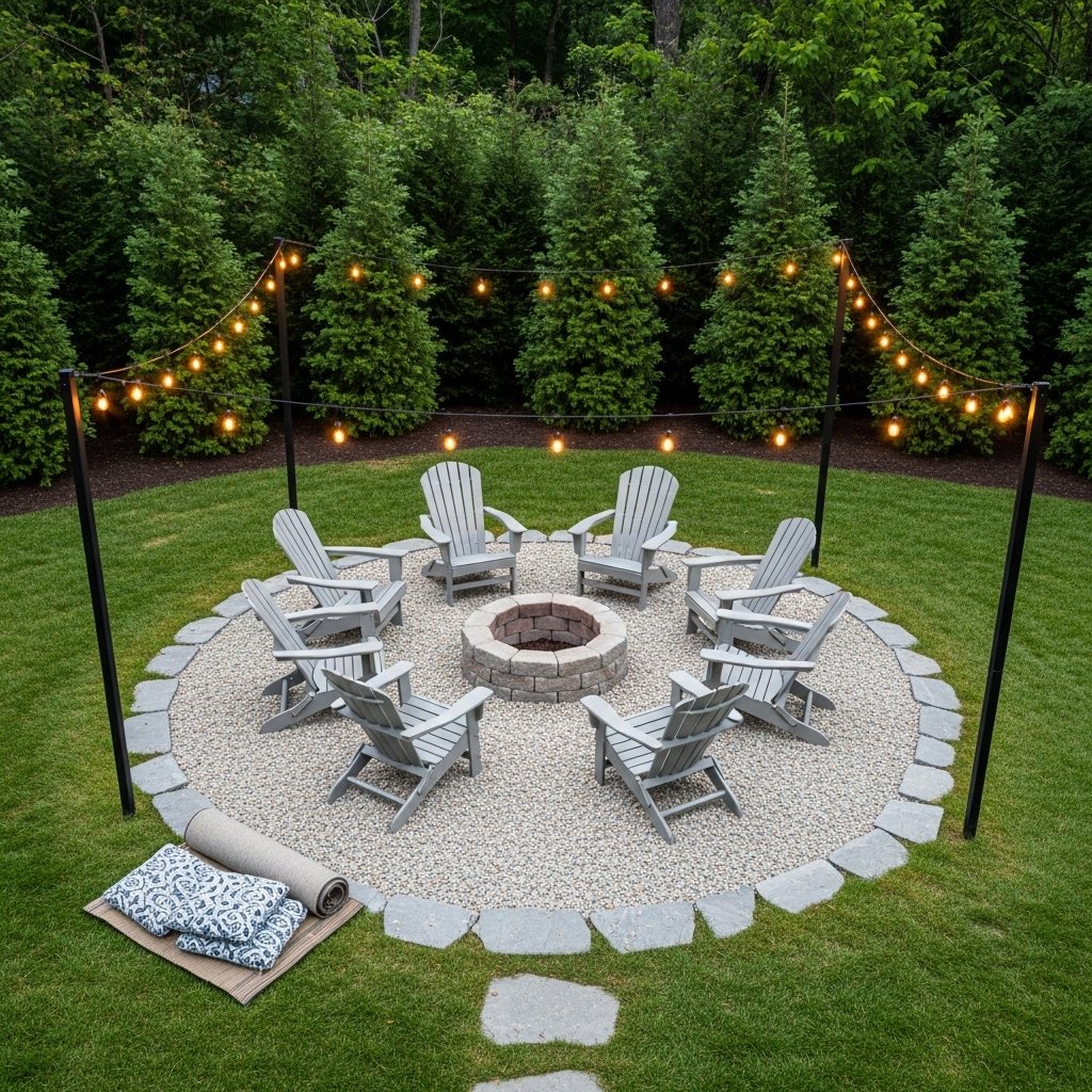 First, construct a simple fire pit ring using stacked stone blocks. Define a large circle around it with a clean border of flagstones. Fill the entire area with light-colored pea gravel for a tidy and handsome look.