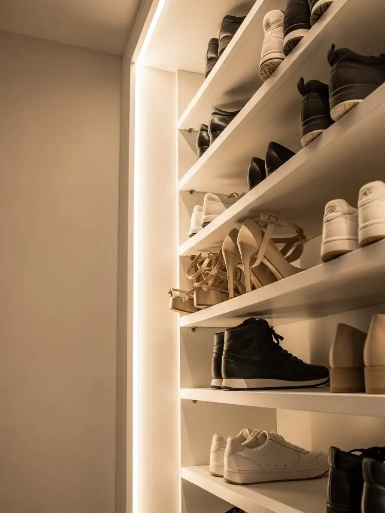 Illuminate your footwear collection with simple LED light strips. This setup turns a dark closet corner into a high end display while making it easier to find your favorite sneakers. You will no longer struggle to distinguish black shoes from navy ones in the shadows.
