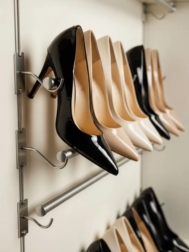 The rods hold the heels securely and prevent the shoes from losing shape. This setup is great for narrow walls that cannot fit traditional shelving. You will love how easy it is to pick the right pair for any event.