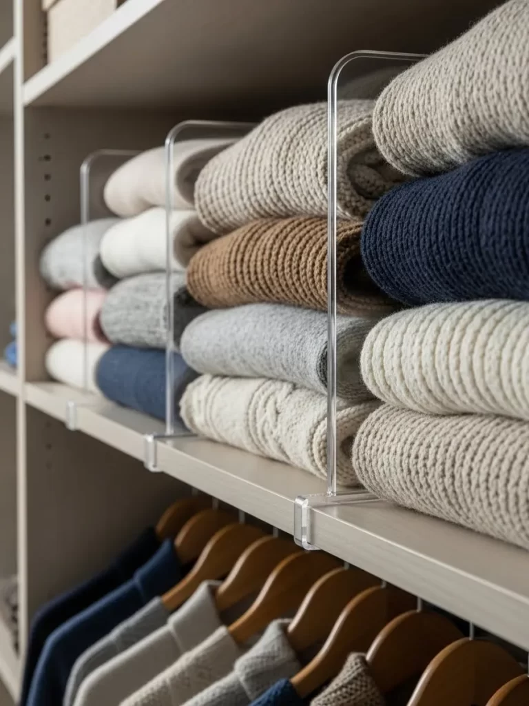 The clear material makes your closet look much larger and more modern. The dividers slide easily onto most standard wooden shelves without any tools or screws. It is a very smart way to keep your knits organized and tidy.