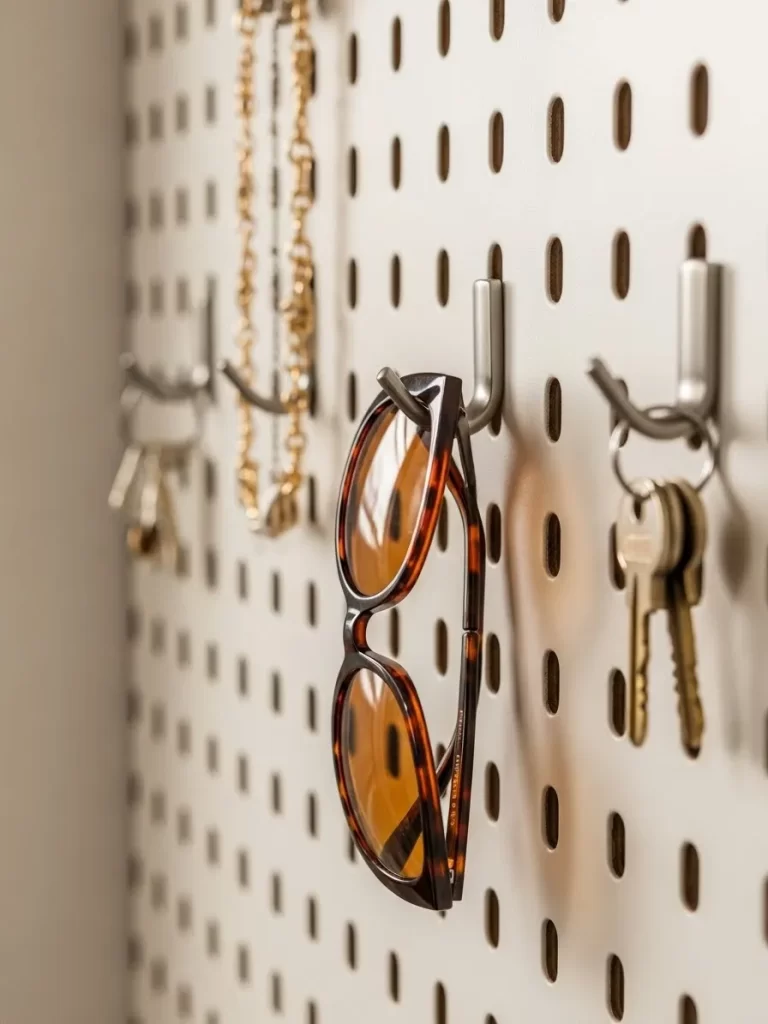 Transform a bare wall into a functional storage station for your daily accessories. A pegboard allows you to hang sunglasses, keys, and jewelry in plain sight. This solution clears up clutter from your dresser tops and keeps small items safe.