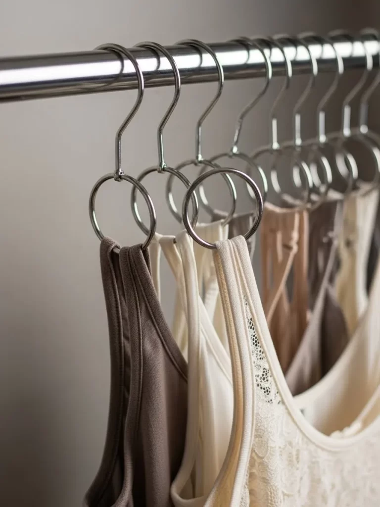 Store many tank tops on a single hanger using metal rings to save hanging space. This method keeps your tops straight and prevents them from getting buried in drawers. You can see every color and style without having to pull items out.