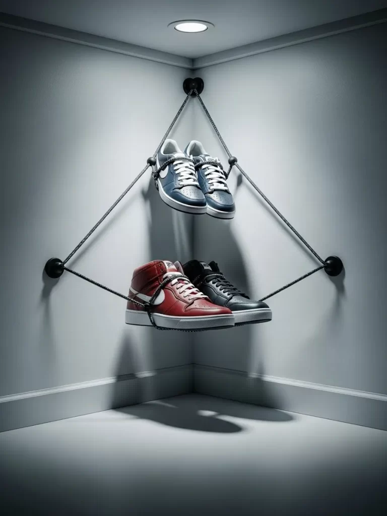 Utilize the empty corners of your closet with a clever cord storage system. This design uses tension to hold sneakers and athletic shoes against the wall. It is a fantastic way to free up floor space for boxes or larger items.