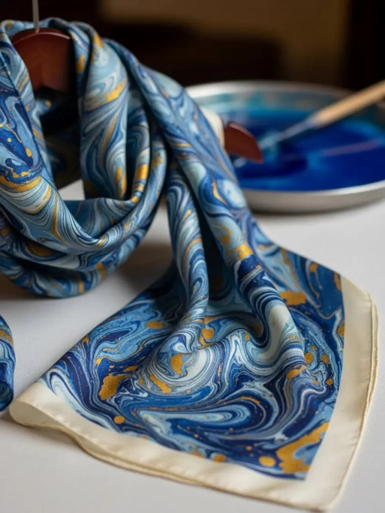 Vibrant blue swirls and golden flecks turn a plain scarf into wearable art. This marbling technique creates one of a kind patterns that flow across the fabric. High quality silk provides a luxurious sheen and a soft feel against the skin. It serves as a bold statement piece for any fashion lover or creative spirit.