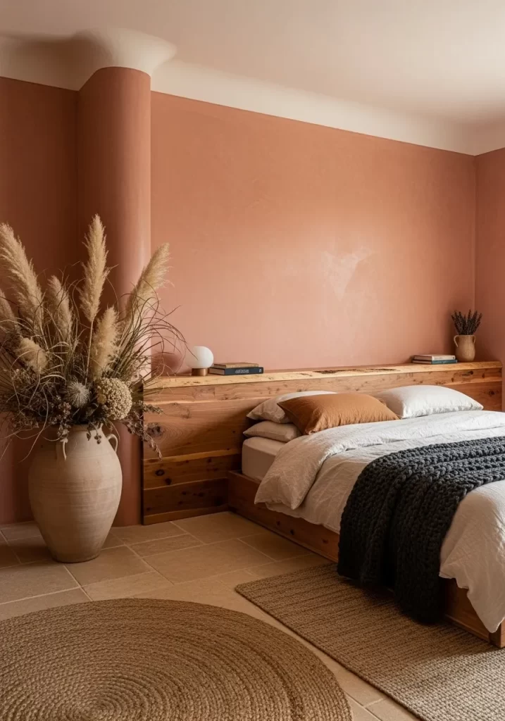 Warm pink walls provide a soft glow against the rough timber. A thick wooden plank rests behind the bed to serve as a functional shelf. Natural light hits the textured clay vase filled with tall pampas grass. This setup feels grounded and very rustic. It uses organic materials to bring life to the space.