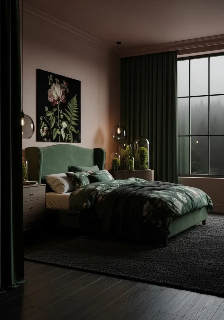 A simple wooden bed frame and log nightstand keep the look raw. Large windows open to a misty forest view for a serene vibe. This room feels like a luxurious cabin in the middle of nature. It is a very grounding and peaceful space for rest.