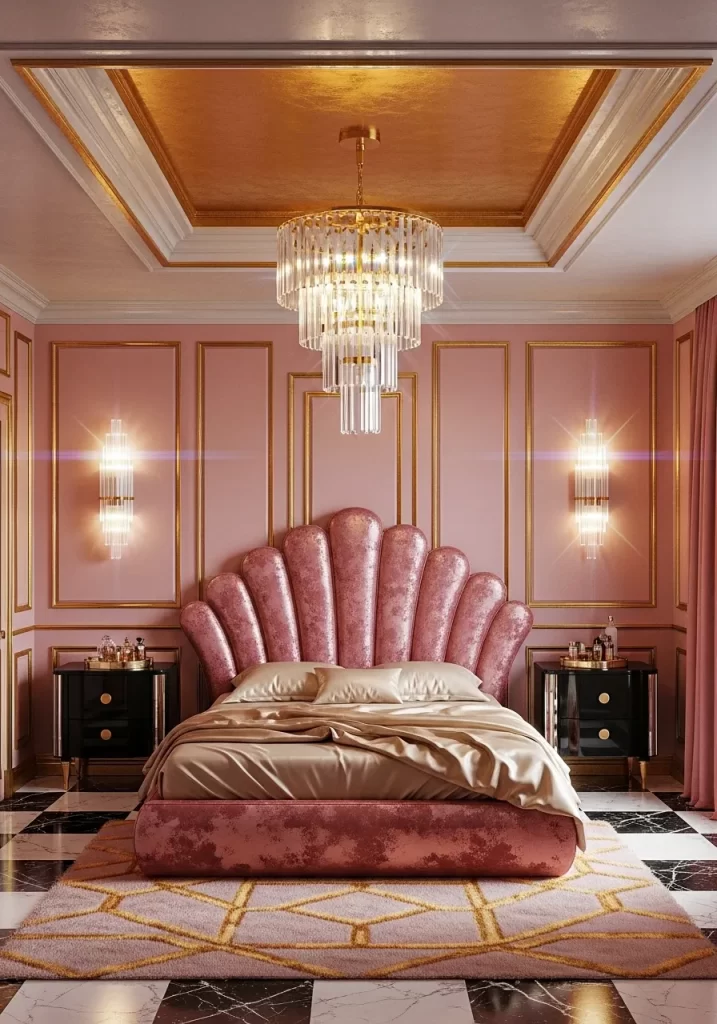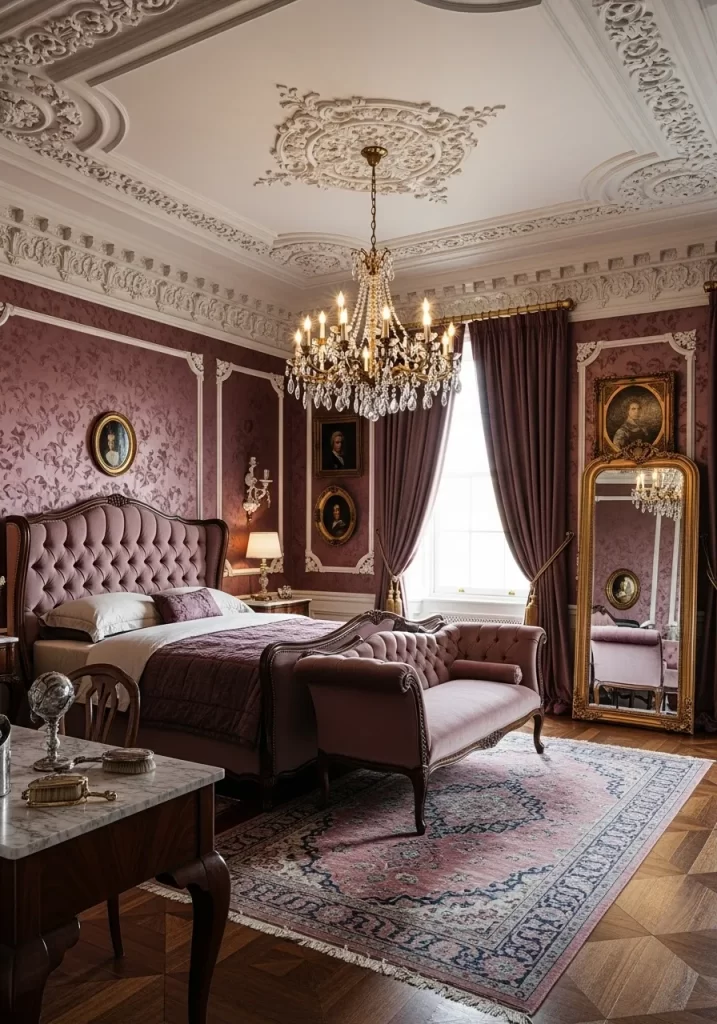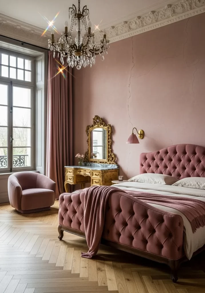 Luxury meets comfort in this stunning vintage setup. A deep mauve tufted headboard anchors the room against soft pink walls. Crystal chandeliers add a touch of sparkle that reflects off the gold vanity. Light wood floors in a chevron pattern keep the space feeling open. Heavy drapes in a matching rose tone block out the cold winter light.