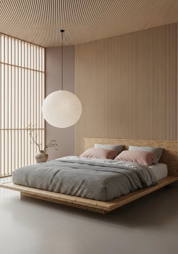 Clean lines and light wood create a peaceful retreat. Vertical slats run from the floor to the ceiling for a tall look. A large paper globe light hangs in the center of the room. This diffused glow softens the sharp edges of the platform bed. Pink pillows add a tiny pop of color to the gray linens.