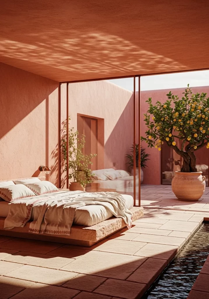 - Paint the walls in a soft terracotta pink to reflect light.