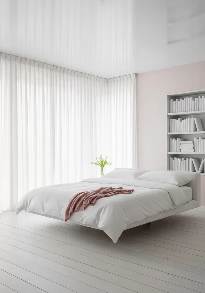 A tall white bookshelf is filled with white covered books for a clean look. A single pink throw blanket adds a tiny touch of color. This room feels incredibly quiet and very calm for sleeping. It is a masterclass in monochromatic and minimal design.