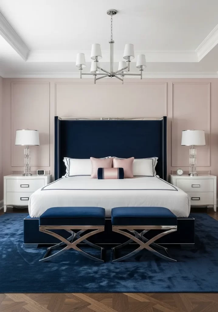 Sophistication and power meet in this high end modern bedroom. A massive navy blue velvet headboard reaches toward the ceiling. Soft blush pink walls provide a gentle contrast to the dark colors. Polished silver accents on the furniture add a touch of shine.