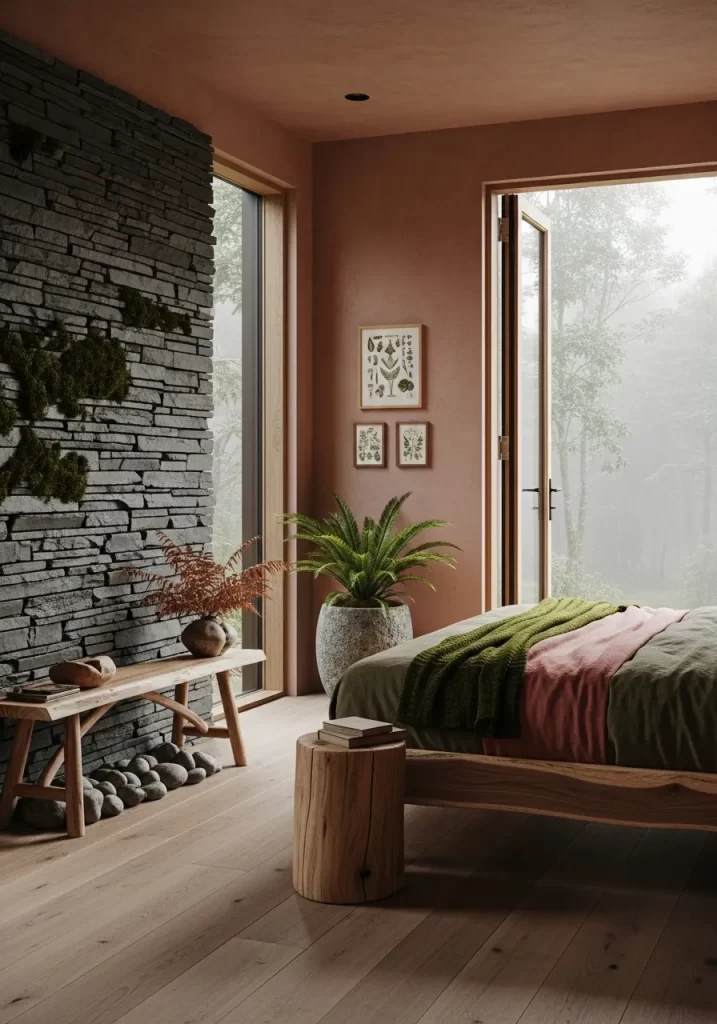 Texture and nature define this earthy and very quiet bedroom. A wall of dark gray slate stones provides a rugged and natural feel. Real green moss grows in the cracks of the stone for an organic touch. Soft terracotta walls glow against the cool gray of the stone.