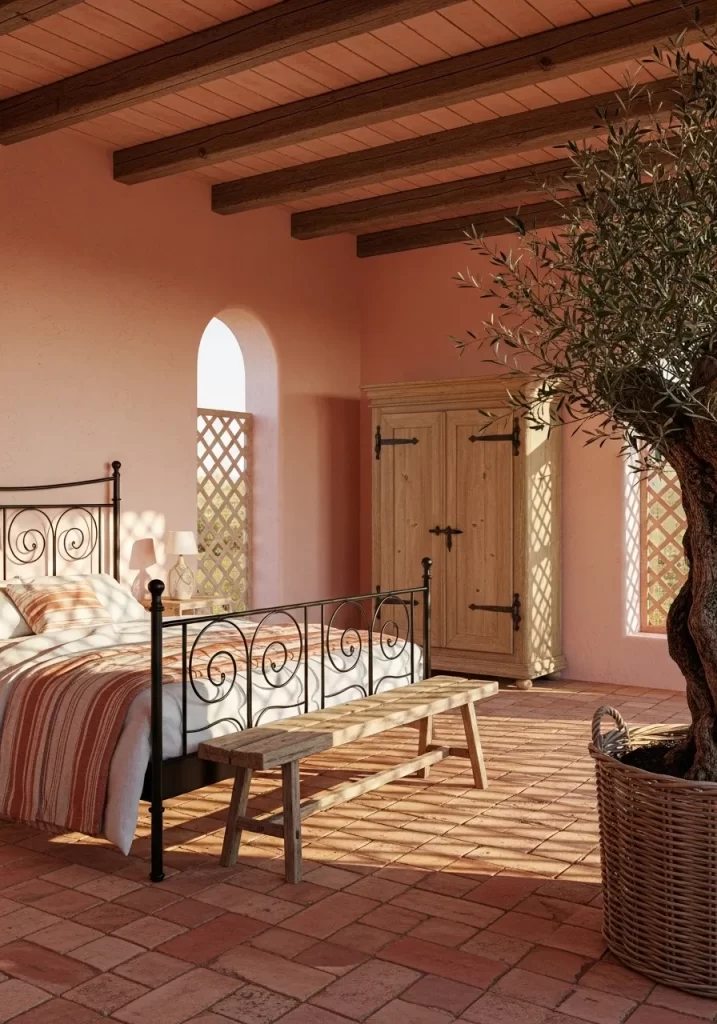Warm terracotta tiles ground this sun drenched room. An elegant black iron bed frame stands out against peach walls. Sunlight pours through arched windows and casts long shadows. A rustic wooden bench sits at the foot of the bed. Olive trees in woven baskets bring life to the corners.