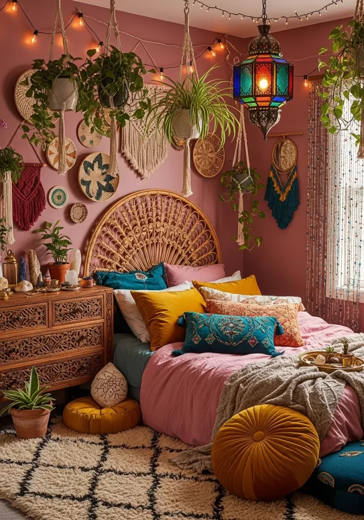 Bohemian energy fills every inch of this vibrant bedroom. A large rattan headboard acts as a focal point with intricate patterns. Macrame hangers hold lush green plants at various heights. Multiple woven baskets decorate the walls like organic pieces of art. Deep mustard and teal pillows contrast with the pink walls.