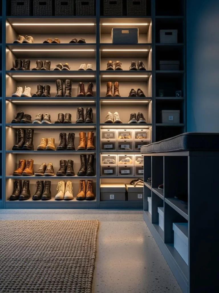 A matching bench sits at the end of the unit. It offers a soft place to sit while you put on your boots. Cubbies inside the bench store smaller items like socks or shoe polish. This design uses vertical space to keep the floor clear.