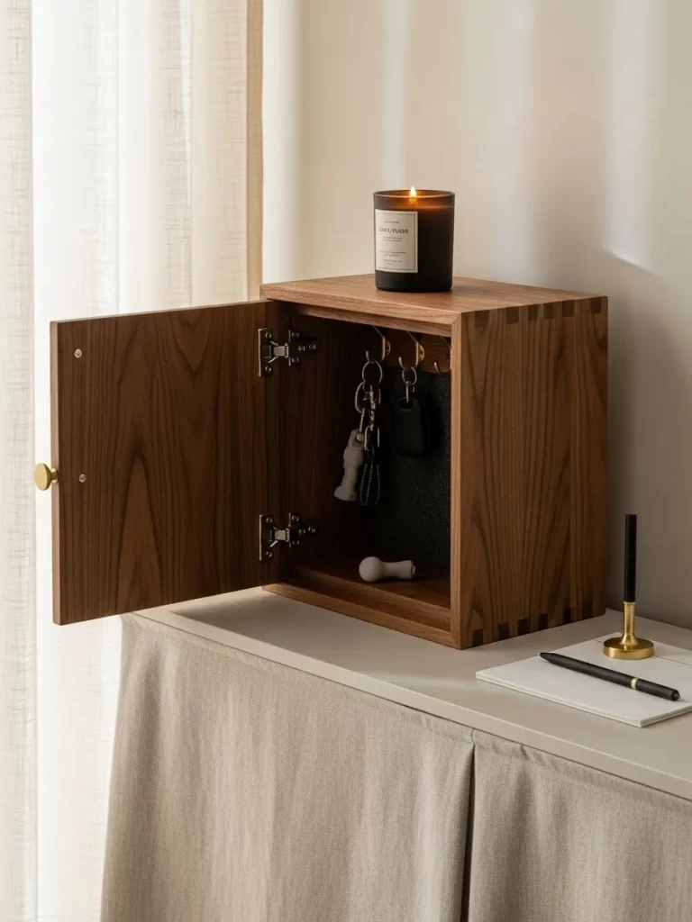 Opening the door reveals several brass hooks for multiple sets of keys. This dedicated spot ensures you never hunt for your car keys while in a rush. The flat top provides a place to set a scented candle for a fresh arrival home.
