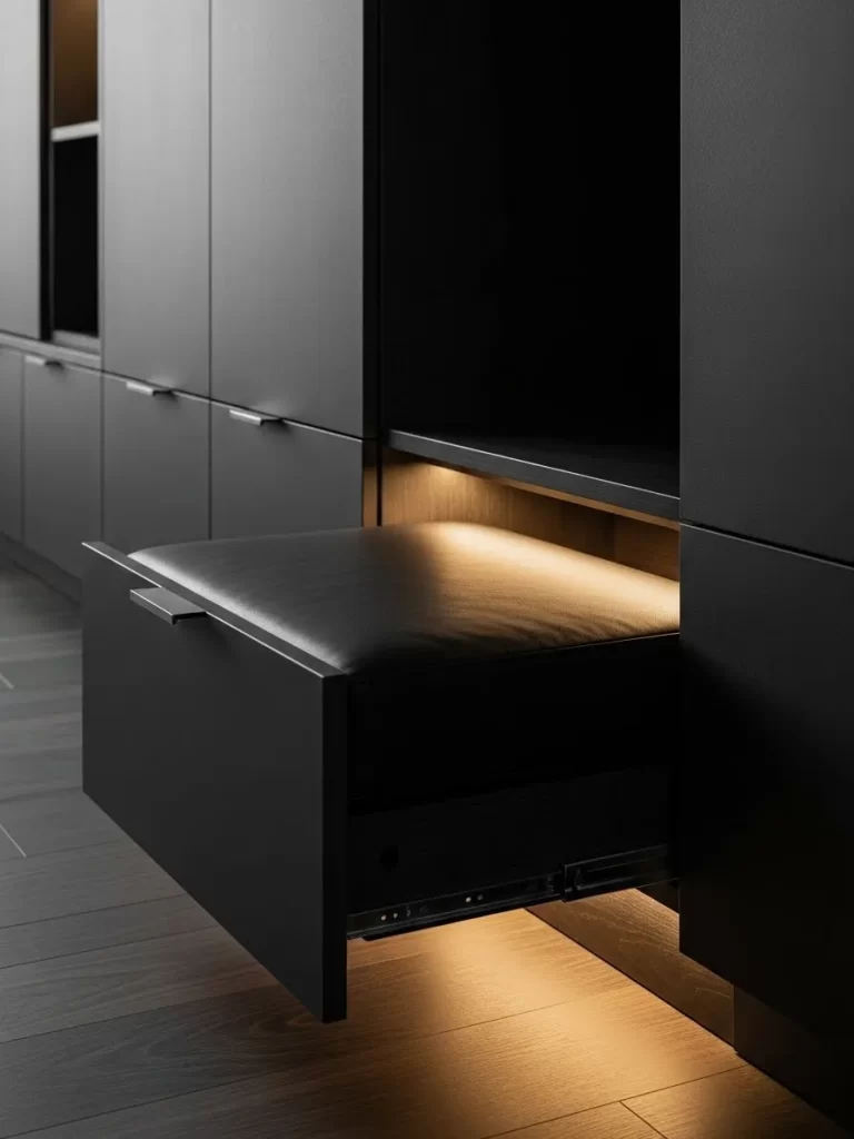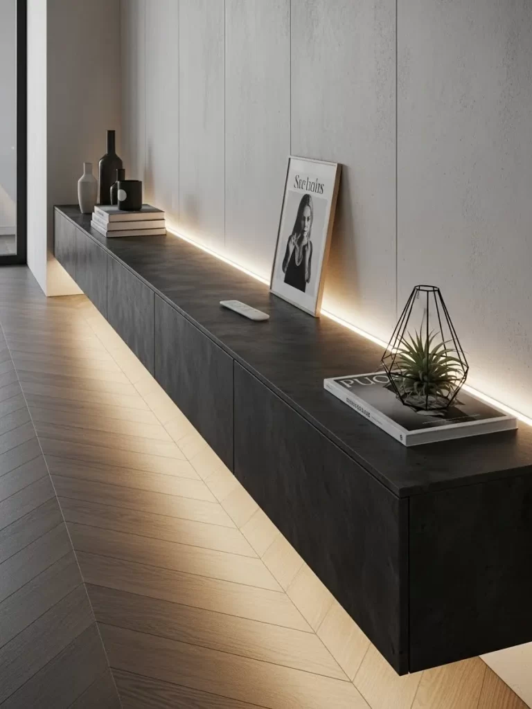A soft glow from an integrated light strip beneath the cabinet adds depth to the room. This lighting makes the heavy piece appear weightless and helps illuminate the walkway. It is a smart way to add massive functionality to a hallway or living room wall without using a single inch of floor space.