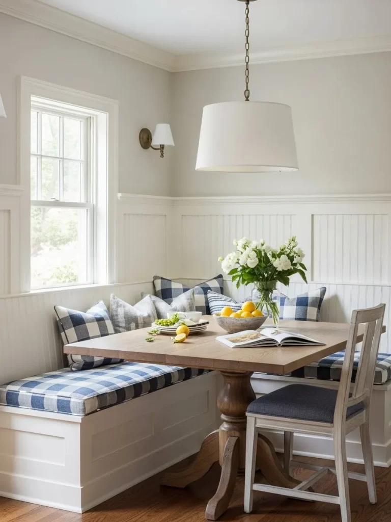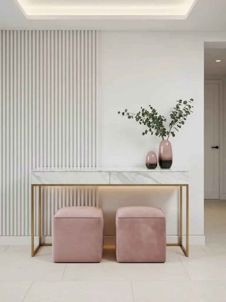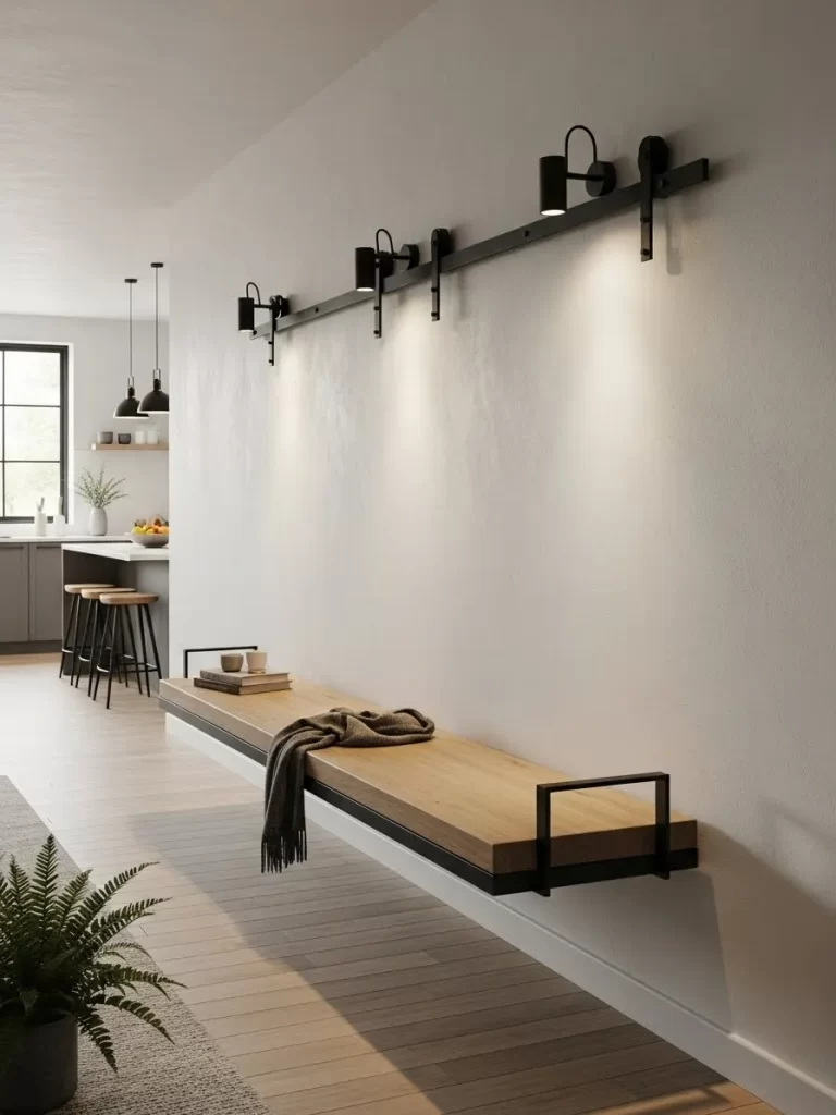 Use your vertical space by mounting benches or stools directly to the wall. This keeps the floor open and makes a small room feel much more airy.