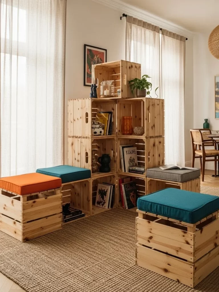Add colorful cushions to the tops of the lower crates. This turns simple storage boxes into comfortable stools. The bright fabric colors bring energy and style to the living room.