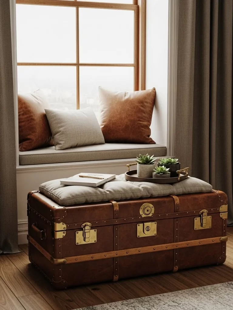 A vintage leather trunk with a top cushion turns an old object into a functional seat. The rich brown leather and gold hardware add history. This piece provides a sturdy surface for sitting.