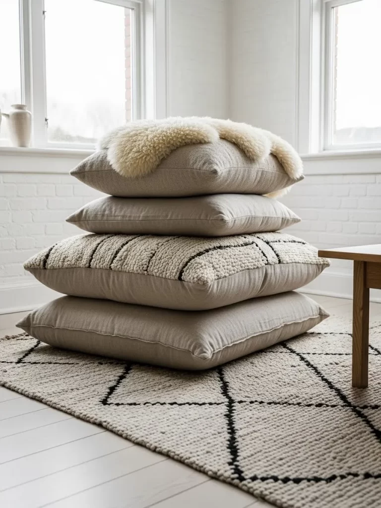 Large terracotta velvet poufs provide a soft and colorful seating option. These square cushions sit directly on the floor and add a cozy feel. You can move them around easily for guests.