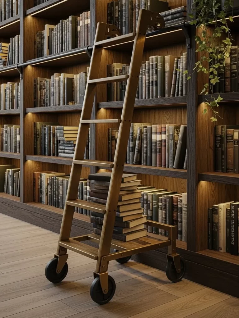 A wood library step chair is a classic piece that transforms into a ladder. The dark wood and brass hinges add a touch of antique style. You can use it as a chair or reach high shelves.