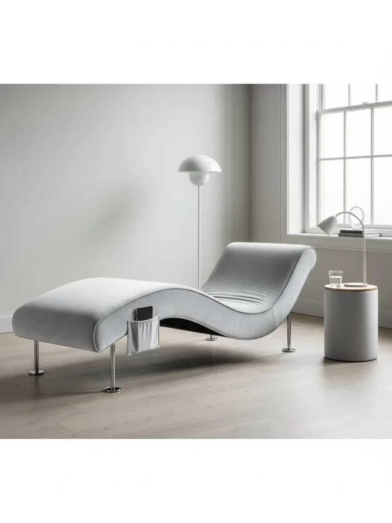 The addition of a fabric storage pocket sewn onto the side of the chair is a resourceful element. This pocket is sized to hold a phone, remote, or book, eliminating the need for a separate side table. The chaise offers maximum relaxation in a relatively narrow footprint.